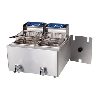 Double your output with the Commercial Twin Tank Deep Fryer ” built for high-demand service environments where speed, volume, and reliability are essential. Featuring two 8¯L stainless steel tanks and twin 3¯kg chrome-plated baskets, this heavy-duty countertop fryer allows you to cook separate items simultaneously with full control. Thermostatic temperature regulation, swing-back elements, and clearly marked oil levels ensure safe and precise operation. Front-mounted drain taps and a removable tank cover make cleaning fast and efficient, while insulated basket handles and an isolating switch add extra safety.