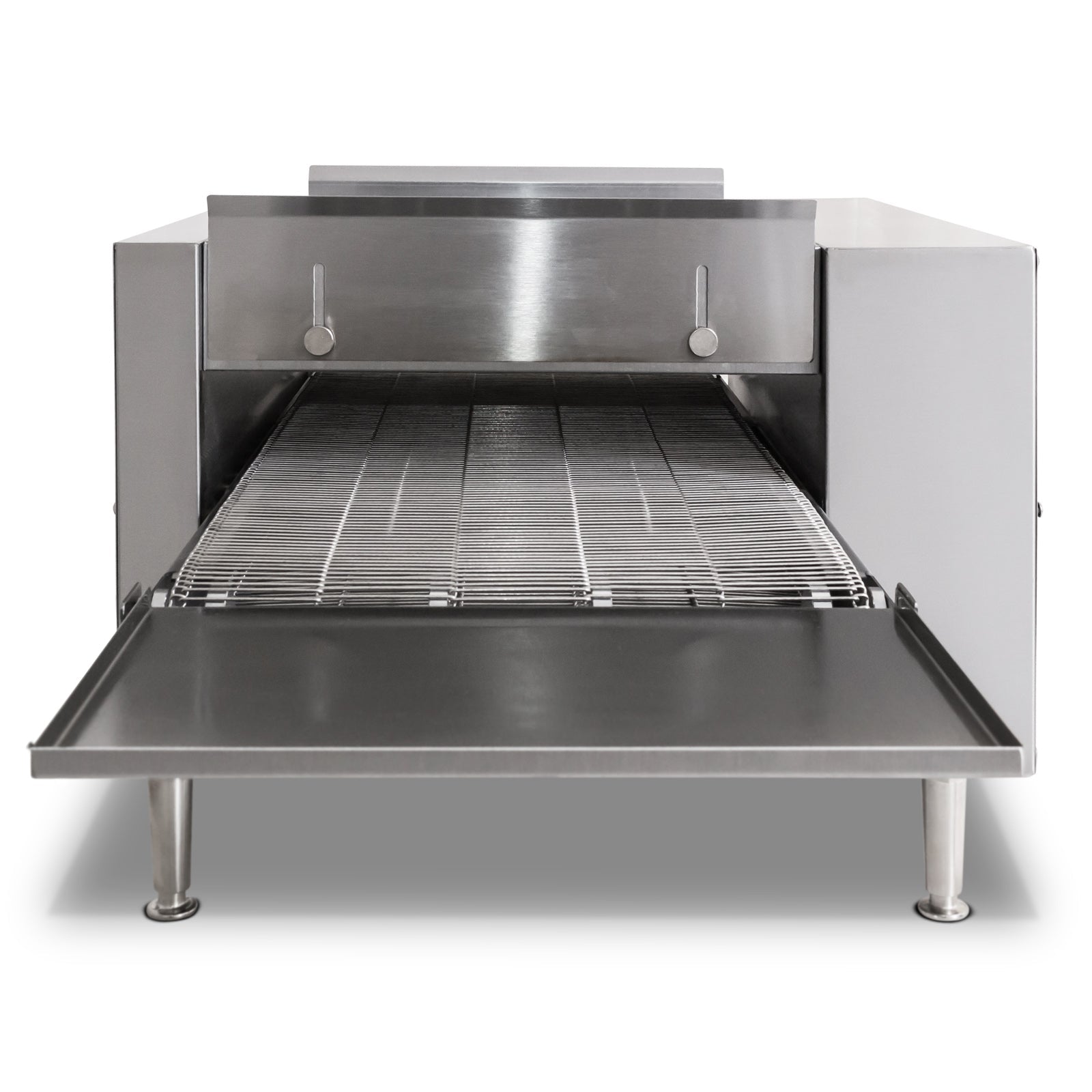 For your convenience, this oven can reverse conveyor direction. This conveyor oven features a long-lasting ceramic heating system in the top of the unit, the design of the heating elements provides a cool touch exterior, which helps prevent burns and other accidents. This pass-through conveyor oven is CE approved.
