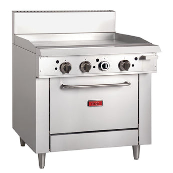The large capacity natural gas freestanding Oven Range with Griddle from market leading brand Thor provides a valuable and versatile addition to commercial catering establishments, including busy restaurants, takeaways and canteens. Made from strong stainless steel and featuring robust dial temperature controls, the Thor Oven Range is durable, easy to clean and provides accurate and precise results. Fitted with flame failure protection as standard.